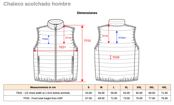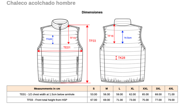 Tallas: S · M · L · XL · 2XL · 3XL · 4XL